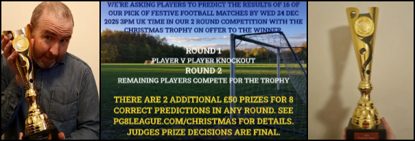 Meanwhile, the Super Cup, League Cup, FA Cup and Champions Cup all award a trophy for keeps to each winner, with the Christmas and Easter Trophies offering high cash value Amazon Vouchers or equivalent. We also have a Player of the Month award with the winner of that getting a £5 Amazon Voucher or equivalent prize.