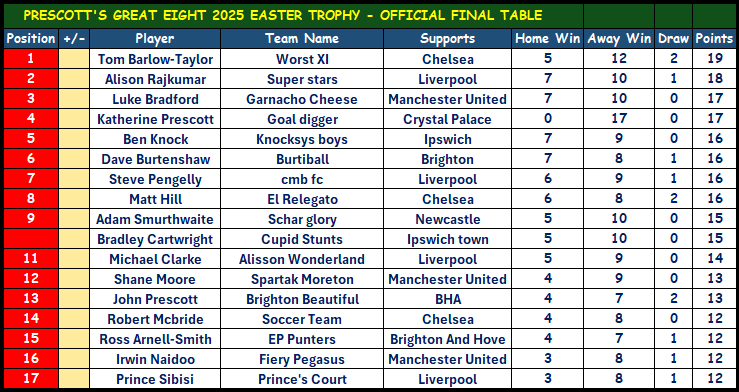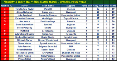 In 2025 Tom Barlow-Taylor relied on the final game, a Chelsea draw against Manchester City, to clinch his place in PG8 history as the only player to win 3 significant prizes. His previous awards include last season's Super Cup and Easter Trophy, so quite the achievement to be so consistent in the space of 17 months. You can check see how Tom and his 15 rivals got on HERE.