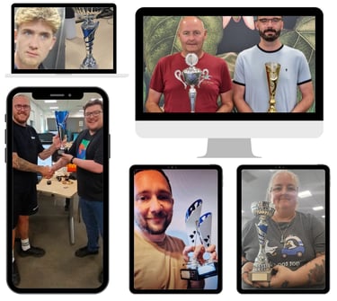 Our current cup champions are Samantha Lane (pictured), 2025 Super Cup Winner, Michael Clarke (pictured), 2025 League Cup Winner, Bradley Cartwright (pictured), 2025 FA Cup Winner and Ross Arnell-Smith, the 2025 Champions Cup Champion winner (pictured).