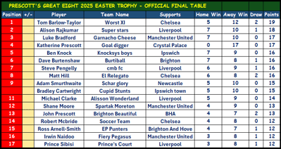 In 2025 Tom Barlow-Taylor relied on the final game, a Chelsea draw against Manchester City, to clinch his place in PG8 history as the only player to win 3 significant prizes. His previous awards include last season's Super Cup and Easter Trophy, so quite the achievement to be so consistent in the space of 17 months. You can check see how Tom and his 15 rivals got on HERE.